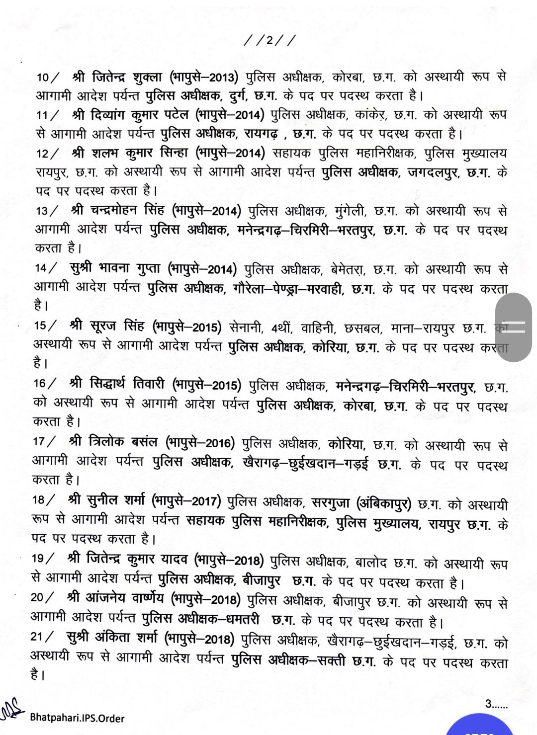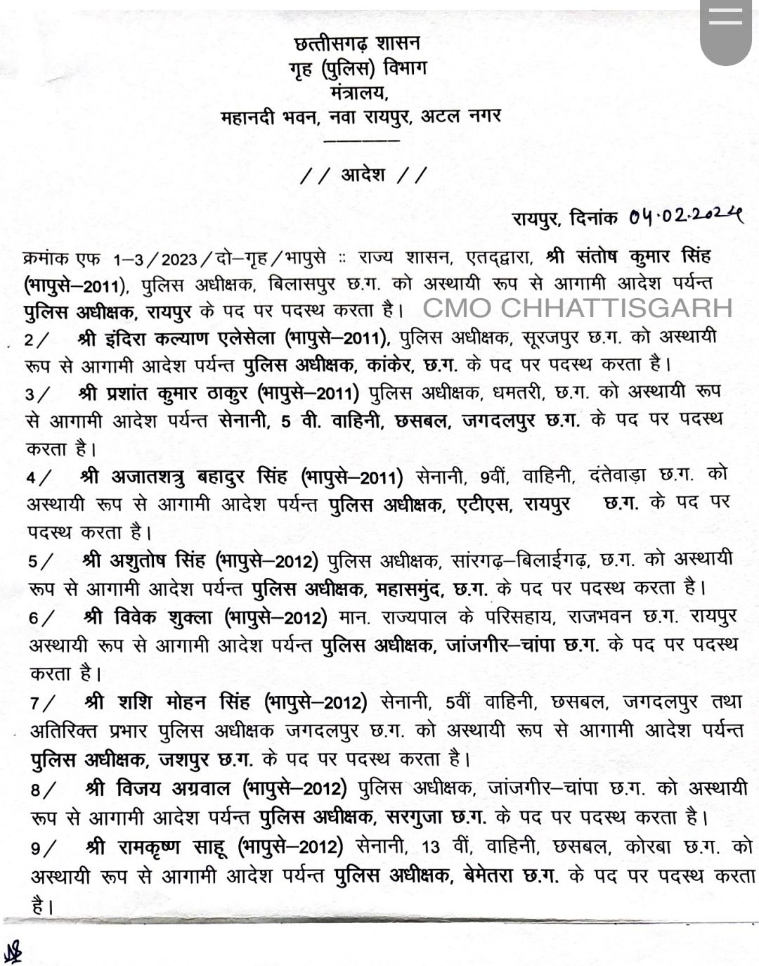देर रात राज्य सरकार ने बड़ी संख्या में आईजी और एसपी के तबादले किए हैं बिलासपुर,रायपुर, जशपुर, बलौदाबाजार, रायगढ़ सहित कई जिलों के एसपी को राज्य सरकार ने बदल दिया है