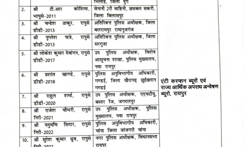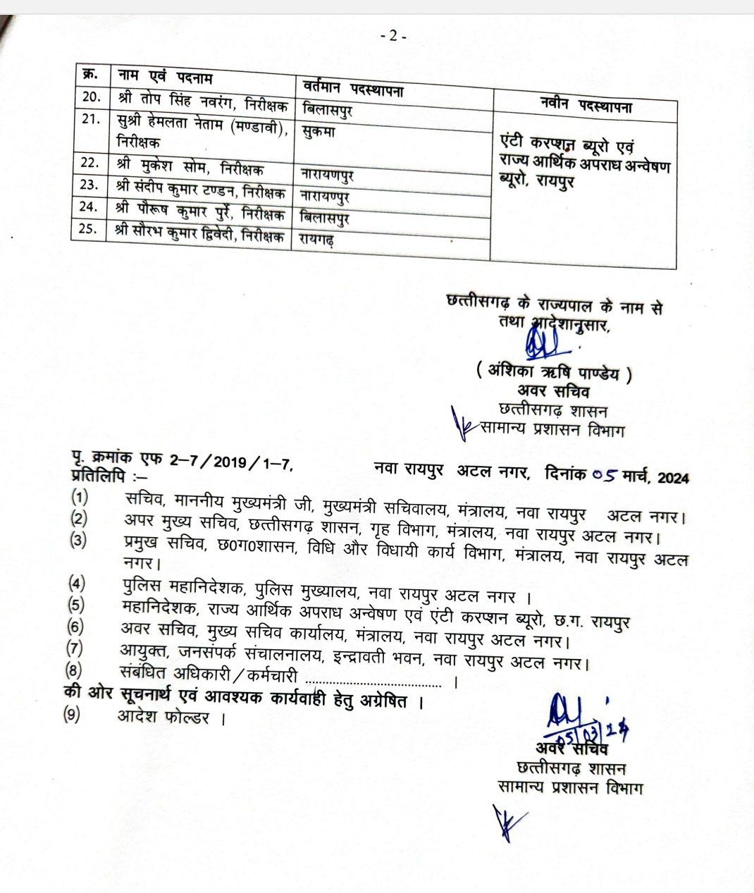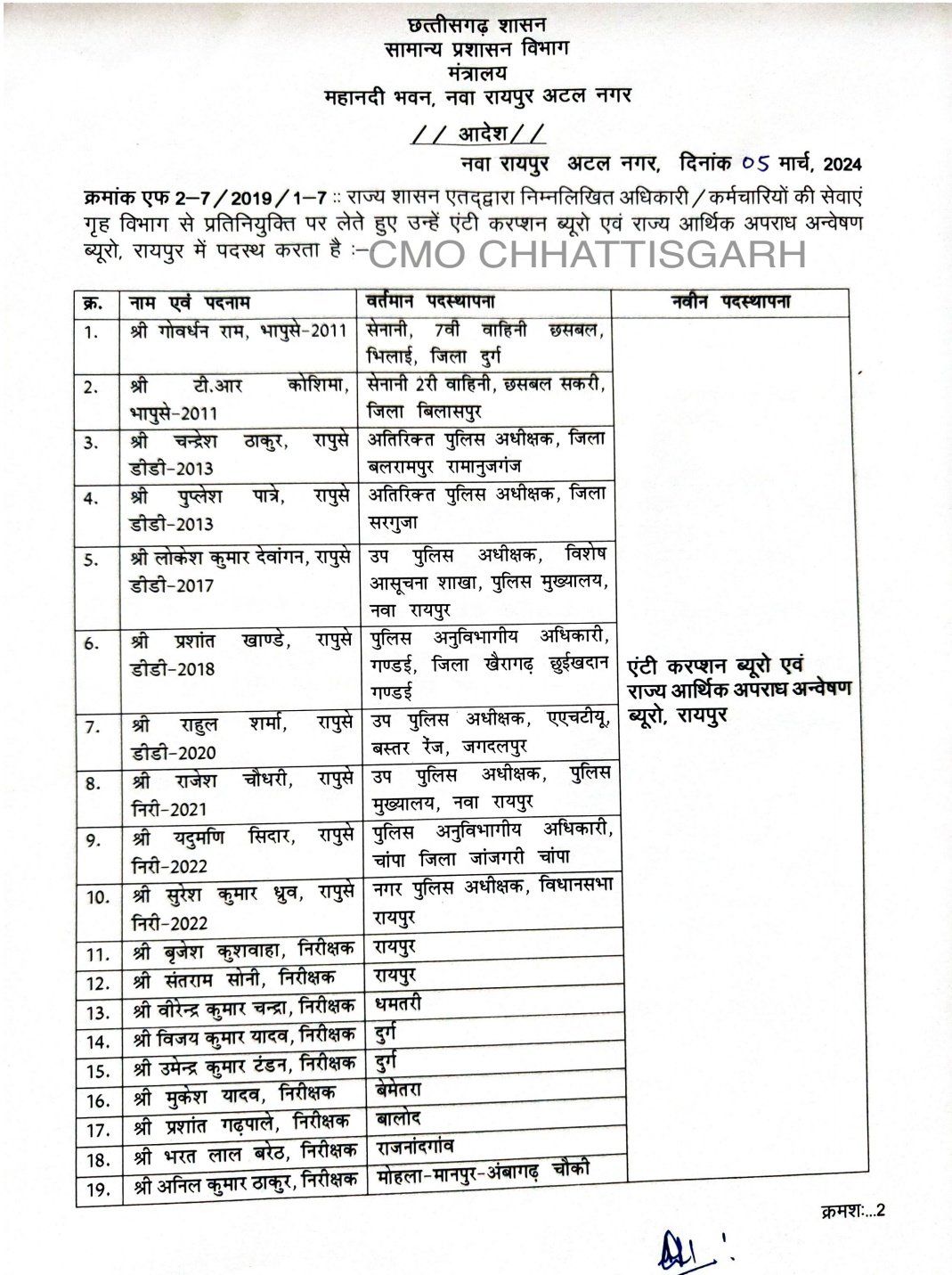 राज्य शासन द्वारा भारतीय पुलिस सेवा के अधिकारी श्री गोवर्धन राम , राज्य पुलिस सेवा के 8 अधिकारियों और 15 पुलिस निरीक्षकों की एंटी करप्शन ब्यूरो एवं राज्य आर्थिक अपराध अन्वेषण ब्यूरो में प्रतिनियुक्ति पर पदस्थापना की गई।