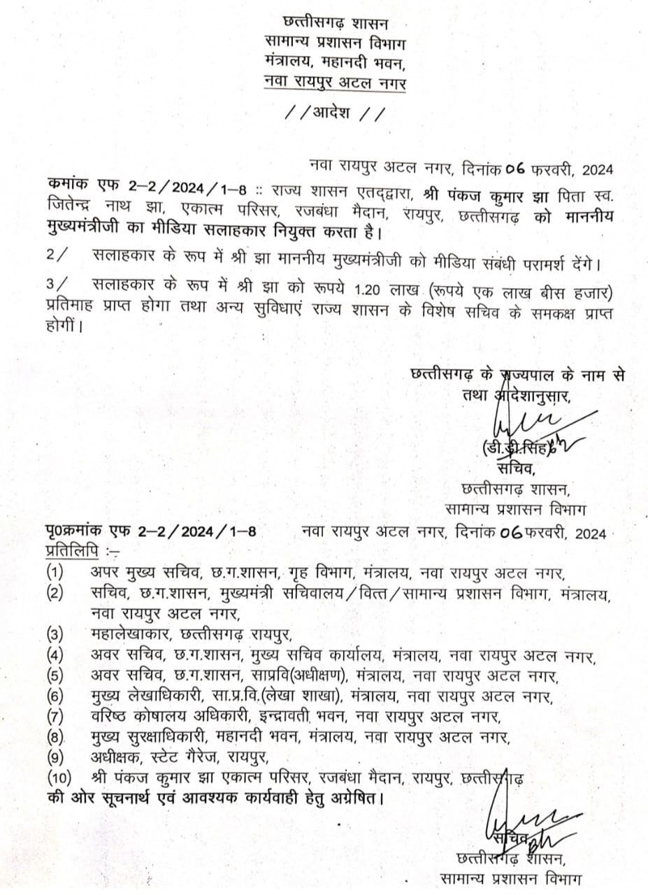 पंकज झा मुख्यमंत्री विष्णुदेव साय के मीडिया सलाहकार होंगे। राज्य सरकार ने पंकज झा की नियुक्ति का आदेश जारी कर दिया है।