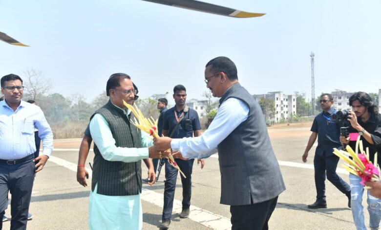 कारली हेलीपैड में जनप्रतिनिधियों और अधिकारियों ने मुख्यमंत्री श्री विष्णु देव साय का किया आत्मीय स्वागत