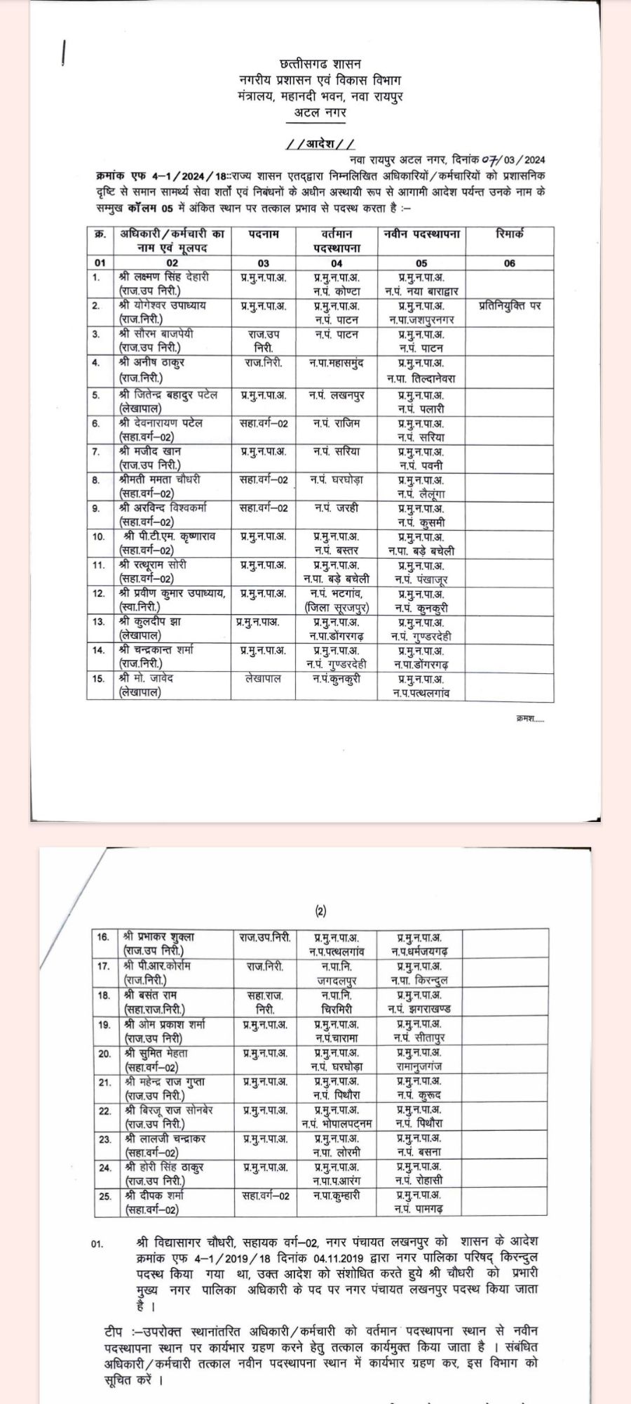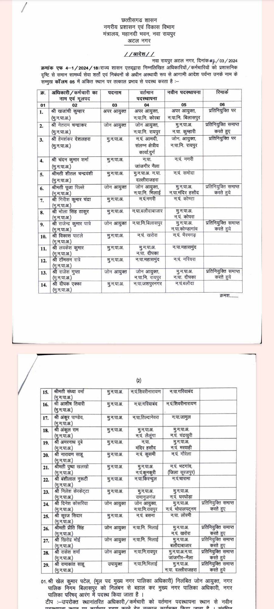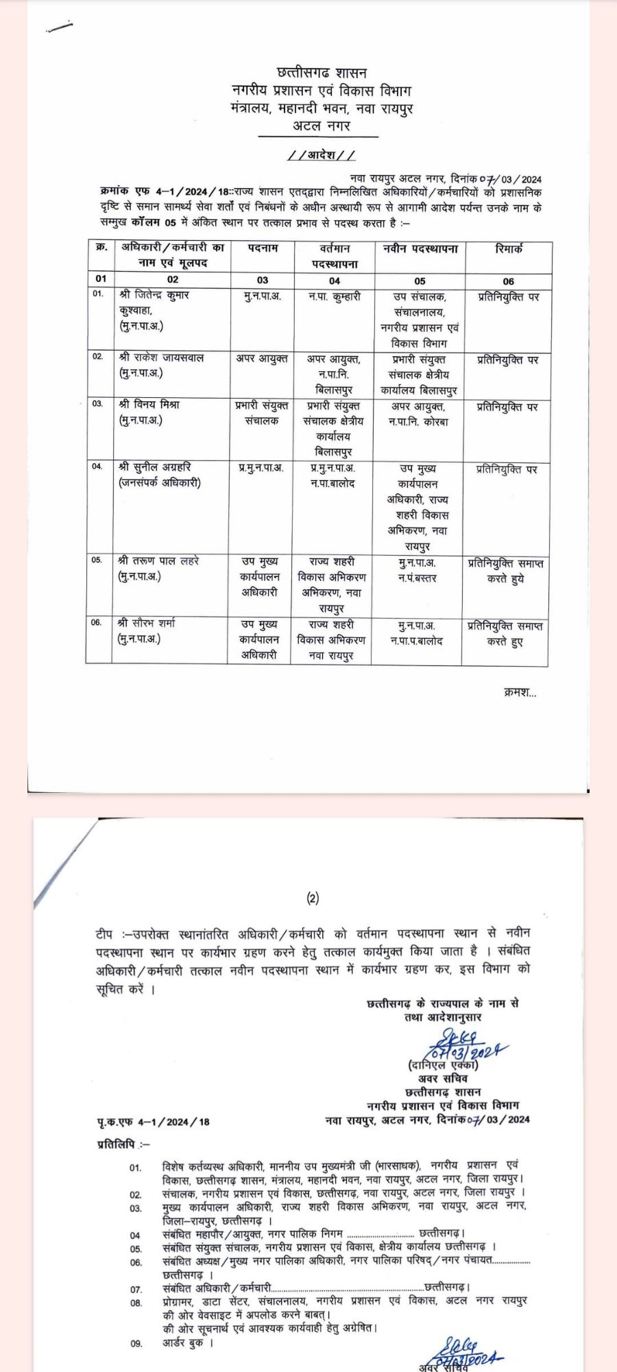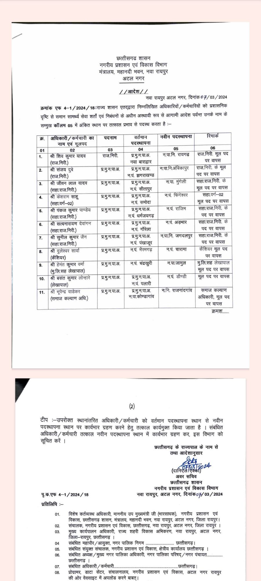 राज्य शासन ने नगरीय प्रशासन विभाग में बड़ी संख्या में अधिकारियों के तबादले किये हैं।