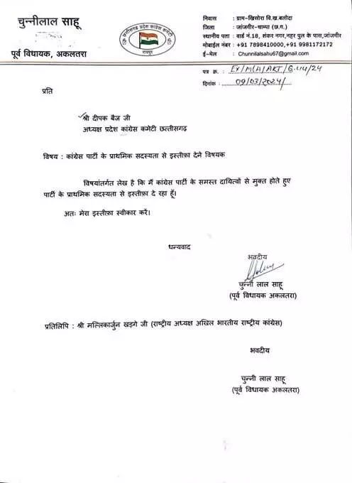 लोकसभा चुनाव से पहले कांग्रेस को झटका, अकलतरा के पूर्व विधायक चुन्नीलाल साहू ने दिया इस्तीफा