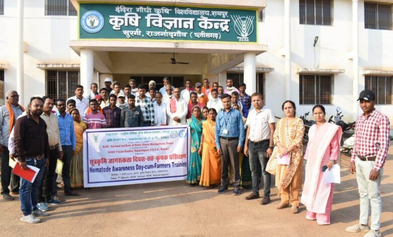 भारतीय कृषि अनुसंधान परिषद राष्ट्रीय जैविक स्ट्रेस प्रबंधन संस्थान रायपुर द्वारा कृषि विज्ञान केन्द्र राजनांदगांव में सूत्रकृमि जागरूकता दिवस – सह कृषक प्रशिक्षण कार्यक्रम का आयोजन किया गया। कार्यक्रम में कृषि विज्ञान केन्द्र राजनांदगांव की वरिष्ठ वैज्ञानिक एवं प्रमुख डॉ. गुंजन झा ने सूत्रकृमि का नियंत्रण से मृदा में गहरी जुताई एवं प्राकृतिक खेती के लाभ के बारे में जानकारी दी। उन्होंने बताया कि प्राकृतिक खेती से वातावरण एवं मृदा की उपजाऊ क्षमता, मृदा में उपस्थित विभिन्न प्रकार के सूक्ष्मजीव एवं देशी केचुओं की संख्या में वृद्धि होती है। भारतीय कृषि अनुसंधान परिषद राष्ट्रीय जैविक स्ट्रेस प्रबंधन संस्थान रायपुर के वैज्ञानिक श्री मल्लिकार्जुन ने फसलों में सूत्रकृमि की पहचान, उसके लक्षण, उससे होने वाले हानि तथा सूत्रकृमि से फसलों को नियंत्रण के लिए विभिन्न भौतिक, जैविक व रासायनिक प्रबंधन के बारे में विस्तृत जानकारी दी।
