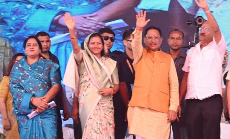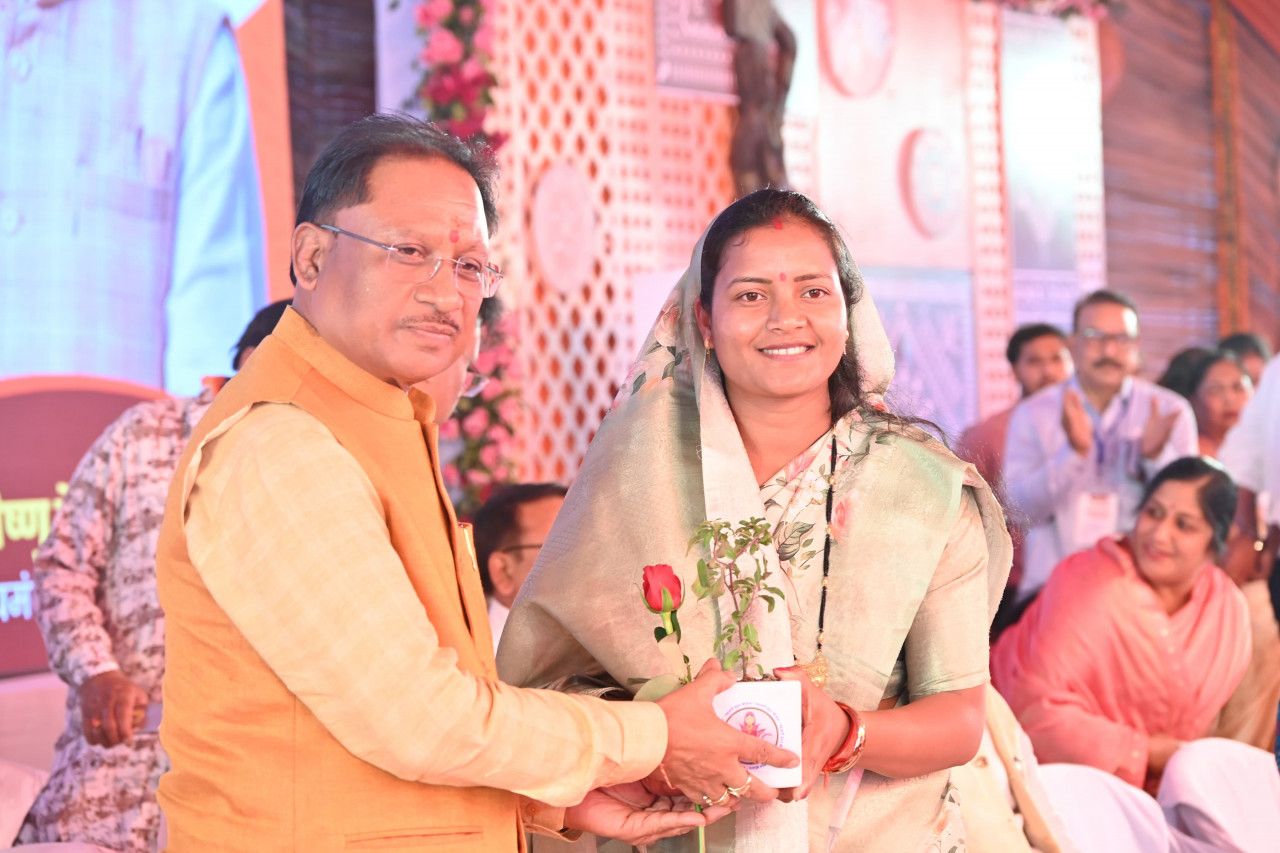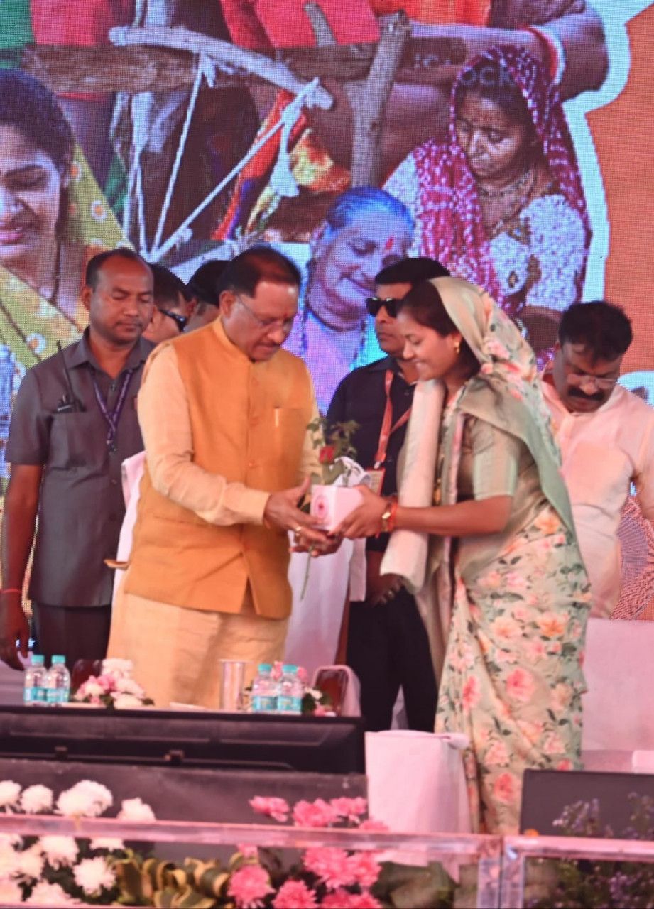 मुख्यमंत्री श्री विष्णु देव साय का महिला एवं बाल विकास मंत्री श्रीमती लक्ष्मी राजवाड़े ने तुलसी का पौधा भेंटकर कार्यक्रम स्थल पर किया स्वागत