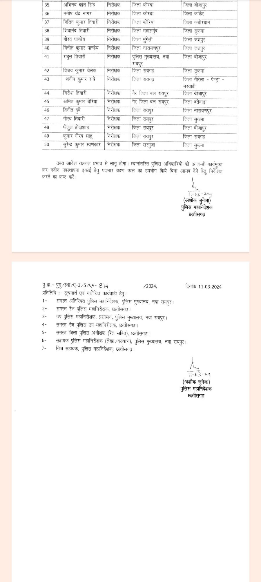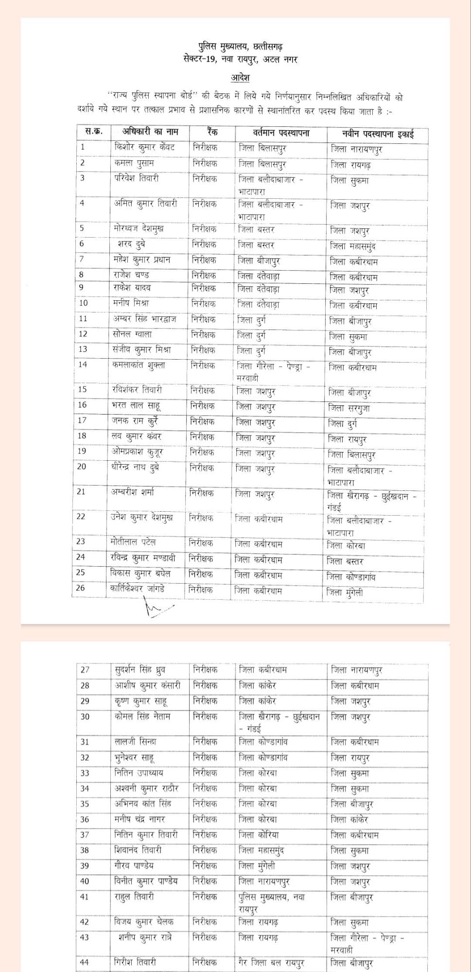 छत्तीसगढ़ में पुलिस विभाग में बड़े पैमाने पर निरीक्षकों के तबादले किए गए हैं, इसके अलावा पुलिस के कई विभागों में पदस्थ पुलिसकर्मियों का ट्रांसफर किया गया है।