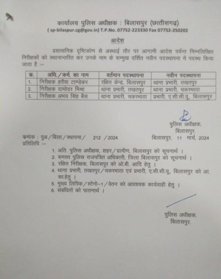 बिलासपुर जिले के एसपी रजनेश सिंह ने 3 निरीक्षक का तबादला आदेश जारी किया है, जिसमें तखतपुर निरीक्षक दामोदर मिश्रा को चकरभाठा थाना की जिम्मेदारी दी है, जबकि अभय सिंह बैस को ACCU व हरीश तांडेकर को तखतपुर थाना भेजा गया है।