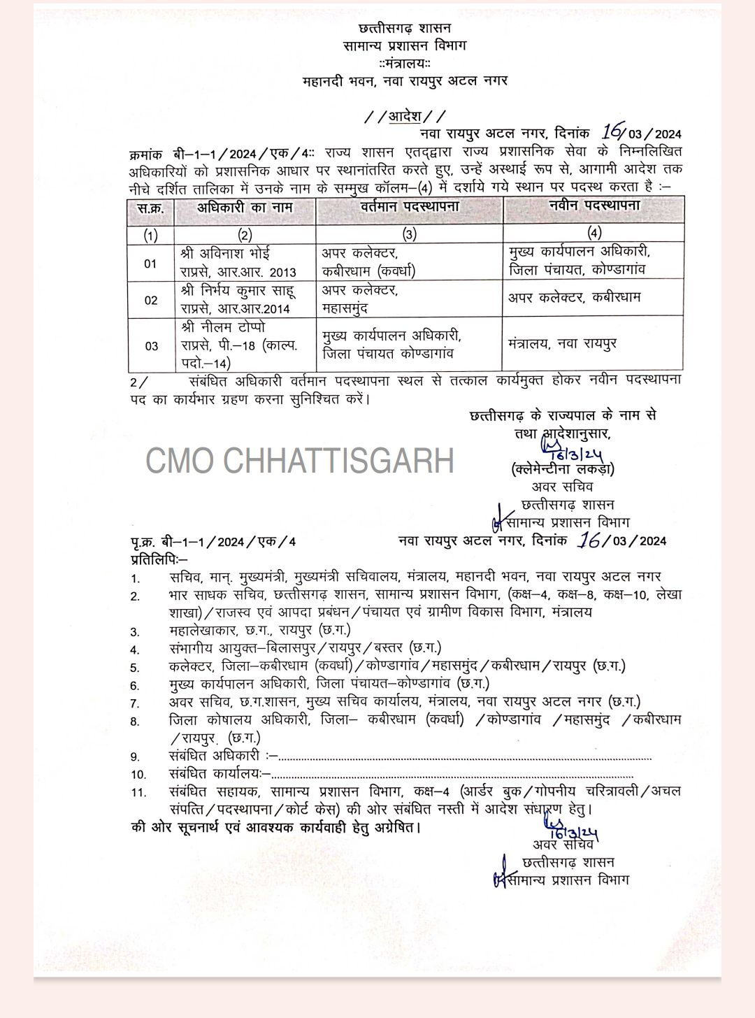 रायपुर राज्य प्रशासनिक सेवा के अधिकारियों का तबादला ‘देखें आदेश’ LIVE EXPRESS CHHATTISGARHMarch 16, 20240 78 रायपुर, 16 मार्च 2024 LIVE EXPRESS CHHATTISGARHMarch 16, 20240 78 Facebook X LinkedIn WhatsApp Telegram Share via Email