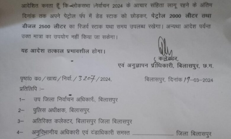 लोकसभा चुनाव में आकस्मिक जरूरत को ध्यान में रखते हुए सभी पम्प संचालकों को डीजल एवं पेेट्रोल की एक निश्चित क्षमता सदैव आरक्षित रखना होगा। कलेक्टर एवं जिला निर्वाचन अधिकारी श्री अवनीश शरण ने इस आशय के आदेश जारी किए है। जिला कार्यालय के खाद्य शाखा द्वारा जारी आदेश के अनुसार पेट्रोल पम्पों में डेड स्टाक को छोड़कर 2 हजार लीटर पेट्रोल तथा 2 हजार 500 लीटर डीजल हर समय रखना होगा। यह आदेश लोकसभा चुनाव के लिए जारी आचार संहिता तक प्रभावशील रहेगा।