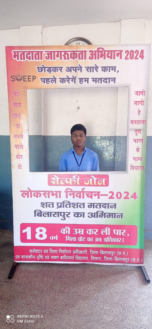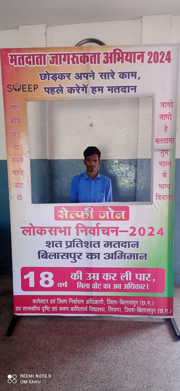 मतदाता जागरूकता कार्यक्रम के तहत शहर के शासकीय दृष्टि एवं श्रवण बाधितार्थ विद्यालय तिफरा में आयोजित कार्यक्रम में दिव्यांग छात्र-छात्राओं ने आकर्षक रंगोली एवं पेंटिंग के माध्यम से मतदाता जागरूकता का संदेश दिया। छात्राओं ने रंगोली बनाकर वोट के महत्व को बताया। यहां बनाए गए सेल्फी जोन में विद्यार्थियों ने सेल्फी भी ली। बिल्हा ब्लॉक के ग्राम पंचायत पेंड्रीडीह में भी स्वीप कार्यक्रम का आयोजन किया गया। जहां स्व सहायता समूह की दीदियों ने सामूहिक रूप से लोकतंत्र में शत प्रतिशत मतदान करने की शपथ ली। दीदियों ने सुवा नृत्य एवं मानव श्रृंखला बनाकर कार्यक्रम को भव्य बना दिया। सभी ने स्वीप होली मनाकर लोगों को मतदान के प्रति जागरूक किया। मतदाता जागरूकता अभियान के तहत नव मतदाता एवं वृद्ध मतदाता का सम्मान किया।