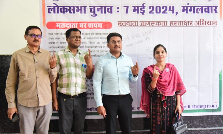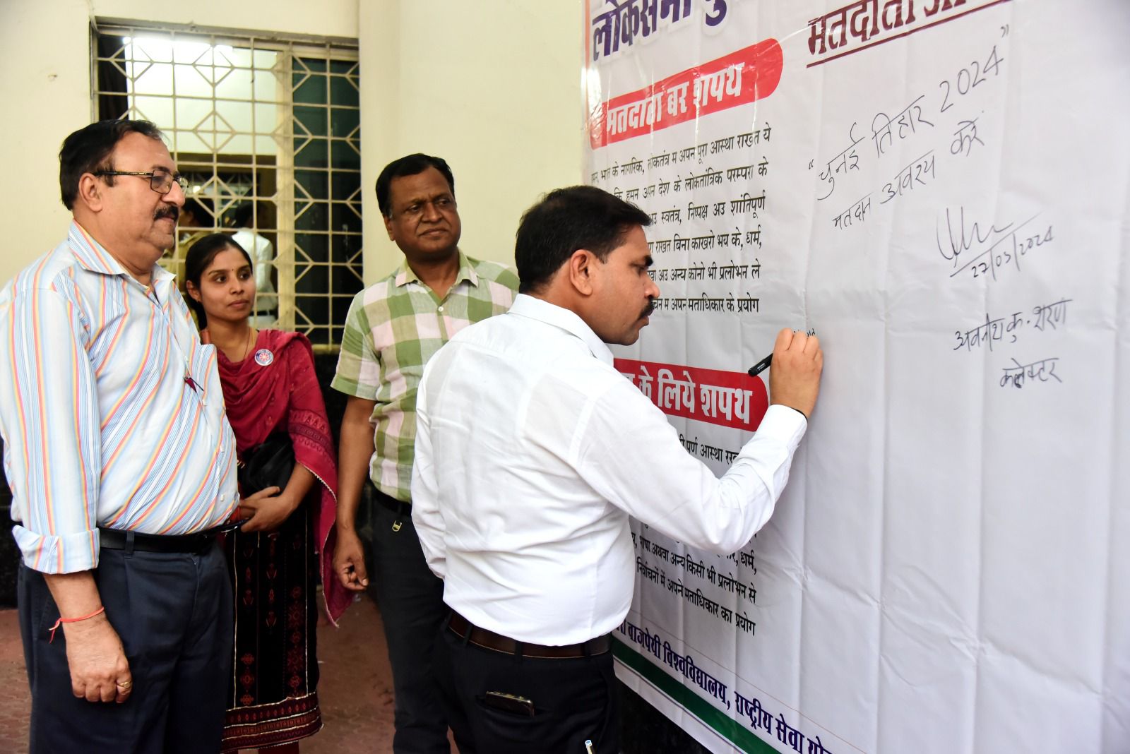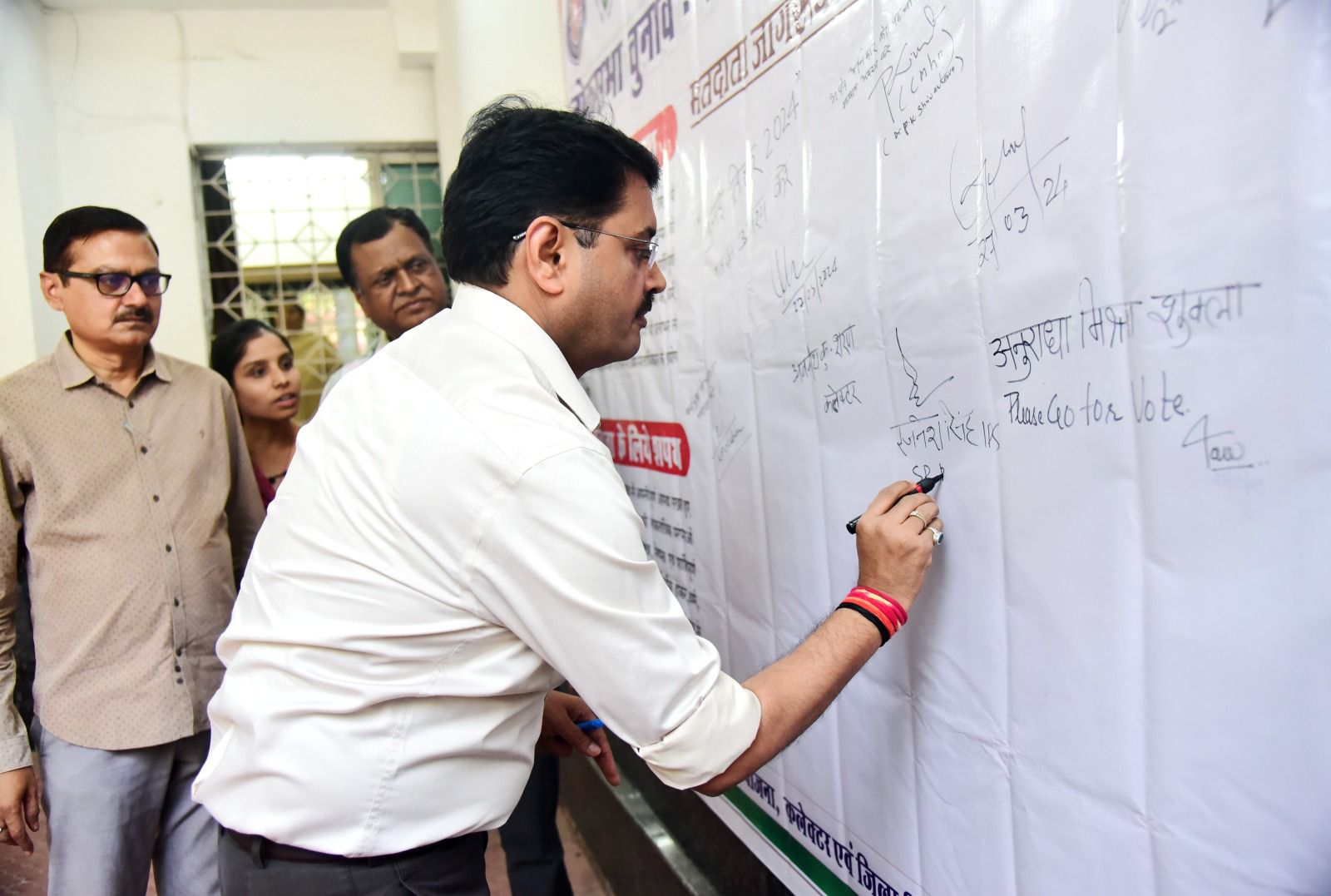 जिले में स्वीप कार्यक्रम के तहत मतदाता जागरूकता अभियान लगातार जारी है। इस अभियान से बड़ी संख्या में महिला स्व सहायता समूह की दीदियां, विद्यालय एवं महाविद्यालयीन छात्र-छात्राआंे सहित ग्रामीण भी जुड़ रहे है। इसी क्रम में जिले में मतदाताओं को जागरूक करने जिला प्रशासन द्वारा हस्ताक्षर अभियान की शुरूआत की गई। कलेक्टर श्री अवनीश शरण एवं एसपी श्री रजनेश सिंह ने कलेक्टोरेट परिसर में स्थापित बोर्ड में लोकसभा चुनाव में अनिवार्य रूप से अपने मताधिकार का उपयोग करने की अपील लिखते हुए हस्ताक्षर किया। सीईओ जिला पंचायत श्री आरपी चौहान समेत जिले के आला अधिकारियों ने भी अपने-अपने हस्ताक्षर कर लोगों से मतदान करने की अपील की।