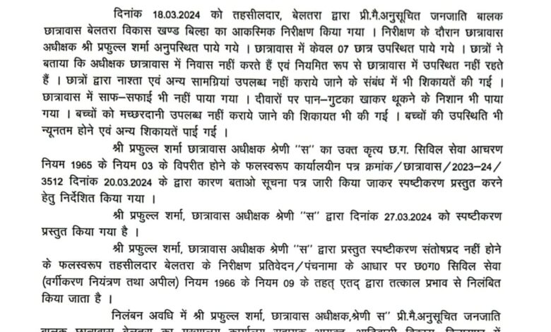 श्री प्रफुल्ल शर्मा, छात्रावास अधीक्षक श्रेणी “स” द्वारा दिनांक 27 मार्च को स्पष्टीकरण प्रस्तुत किया गया है।श्री प्रफुल्ल शर्मा, छात्रावास अधीक्षक श्रेणी “स” द्वारा प्रस्तुत स्पष्टीकरण संतोषप्रद नहीं होने के फलस्वरूप तत्काल प्रभाव से निलंबित किया जाता है । निलंबन अवधि में श्री प्रफुल्ल शर्मा का मुख्यालय कार्यालय सहायक आयुक्त, आदिवासी विकास, बिलासपुर में निर्धारित किया जाता है। श्री शर्मा को नियमानुसार जीवन निर्वाह भत्ते की पात्रता होगी ।