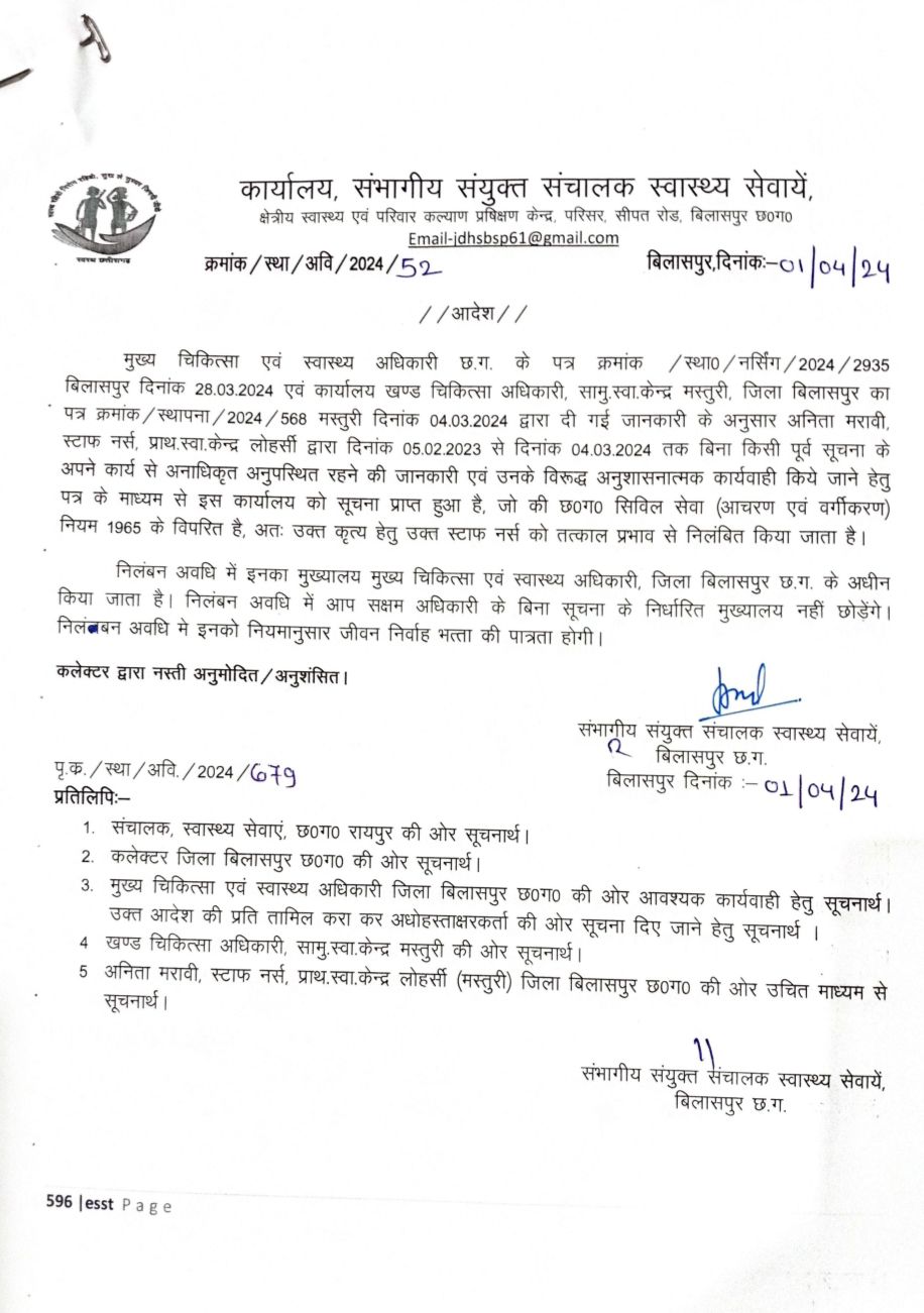 मस्तुरी ब्लॉक के लोहरसी पीएचसी की स्टाफ नर्स अनिता मरावी निलंबित, बिना अनुमति के महीने भर से ड्यूटी से है नदारद…