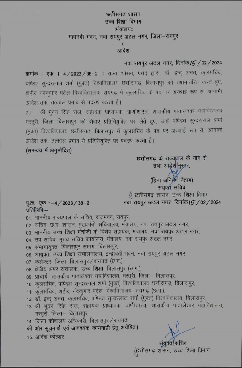 बिलासपुर : डॉ. इन्दु अनंत, कुलसचिव, पण्डित सुन्दरलाल शर्मा (मुक्त) विश्वविद्यालय बिलासपुर को स्थानांतरित करते हुए,शहीद नंदकुमार पटेल विश्वविद्यालय,रायगढ़ में कुलसचिव के पद पर पदस्थ किया गया हैं