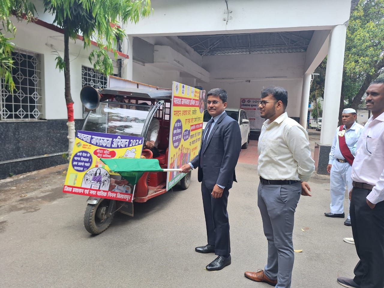 कलेक्टर एवं जिला निर्वाचन अधिकारी अवनीश शरण ने जिला कार्यालय परिसर से मतदाता जागरूकता रथ को हरी झंडी दिखाई, नगर निगम द्वारा तैयार यह रथ विशेषकर शहर के कम मतदान क्षेत्रों में फेरे लगाएगी, लोगों से संपर्क कर चुनाव आयोग के शत प्रतिशत मतदान का संदेश देगी, नगर निगम आयुक्त अमित कुमार भी इस अवसर पर उपस्थित थे।