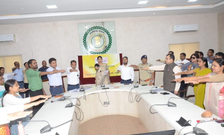कलेक्ट्रेट परिसर रेडक्रॉस सभाकक्ष में मुख्य निर्वाचन पदाधिकारी श्रीमती रीना कंगाले ने दिलाई मतदाता, जागरूकता की शपथ, कलेक्टर डॉ. गौरव सिंह के मार्गदर्शन में स्वीप के तहत मतदाता जागरूकता के लिए किए गए नवाचार की “सराहना”