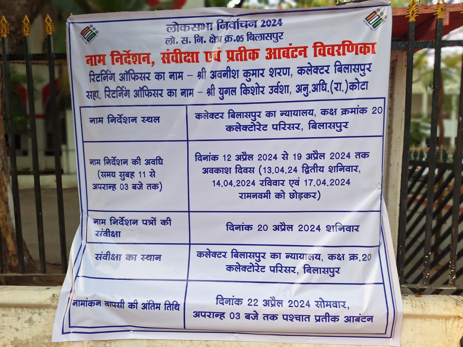 जिला निर्वाचन कार्यालय से प्राप्त जानकारी के अनुसार इस दौरान 13 अप्रैल, 14 अप्रैल और 17 अप्रैल को अवकाश रहेगा। 13 अप्रैल को दूसरा शनिवार, 14 अप्रैल को रविवार और 17 अप्रैल को रामनवमी अवकाश के कारण निर्देशन पत्र नहीं लिया जायेगा। नामांकन निर्देशन पत्रों की जांच 20 अप्रैल 2024 को की जाएगी। नामांकन वापसी की अंतिम तिथि 22 अप्रैल 2024 को दोपहर 3 बजे तक होगा। मतदाता सूची का अवलोकन एवं सत्यापित प्रति उपलब्ध कराने के लिए मंथन सभा कक्ष की गैलरी में व्यवस्था की गई है। विधानसभा वार अपडेट मतदाता सूची का अवलोकन यहां किया जा सकता है। डिप्टी कलेक्टर शिवकुमार कंवर को इस कक्ष का प्रभारी अधिकारी बनाया गया है। इसी स्थल पर जमानत राशि भी लिया जायेगा। महिला सहित सामान्य एवं ओबीसी उम्मीदवारों के लिए 25 हजार रूपये जमानत राशि निर्धारित की गई है। अनुसूचित जाति एवं जनजाति वर्ग के उम्मीदवारों को इसका आधा राशि अर्थात साढ़े 12 हजार रूपये लगेगा। बशर्त उन्हें जाति प्रमाण पत्र उपलब्ध कराना होगा।