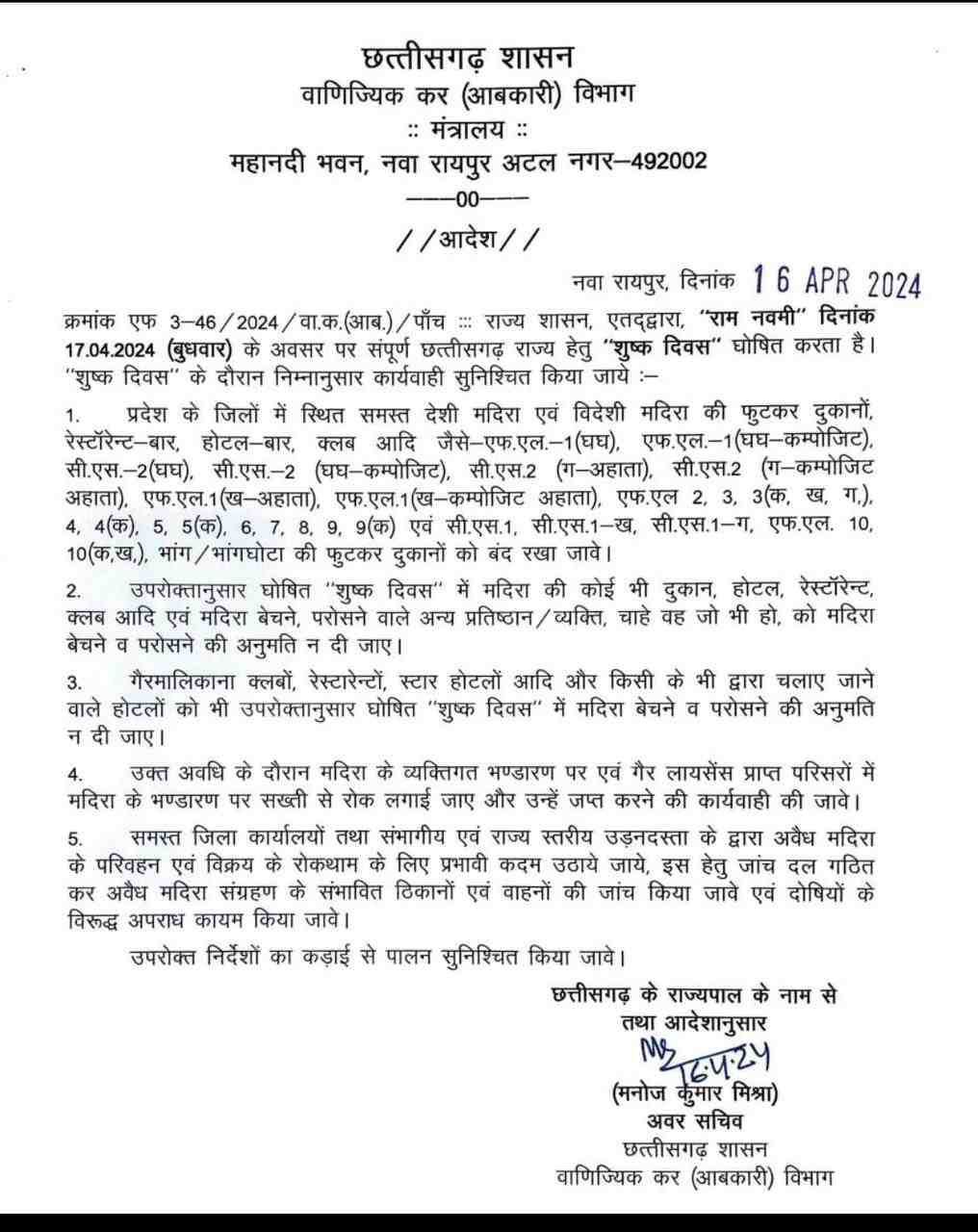 रामनवमी पर छत्तीसगढ़ में 17 अप्रैल 2024 बुधवार को शुष्क दिवस घोषित किया गया है।