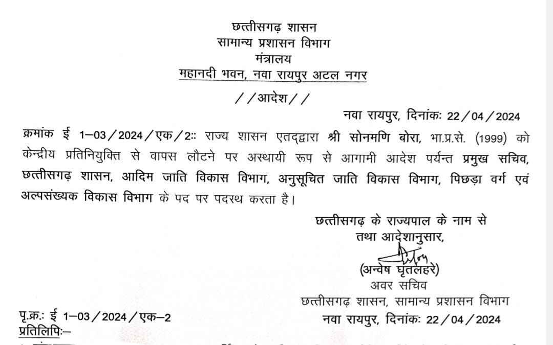 राज्य सरकार ने आईएएस सोनमणि बोरा को पोस्टिंग दी है, उन्हें आदिम जाति, अनुसूचित जाति और पिछड़ा वर्ग विभाग का प्रमुख सचिव बनाया गया है, इस संबंध में सामान्य प्रशासन विभाग ने आदेश जारी किया है।
