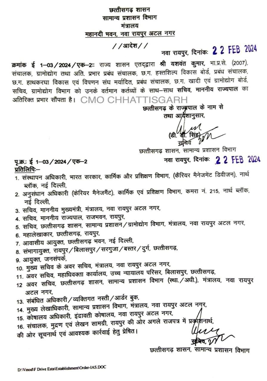 वहीं यशवंत कुमार को राज्यपाल के सचिव का अतिरिक्त प्रभार सौंपा गया है। इस संबंध में सामान्य प्रशासन विभाग ने आदेश जारी किया है।