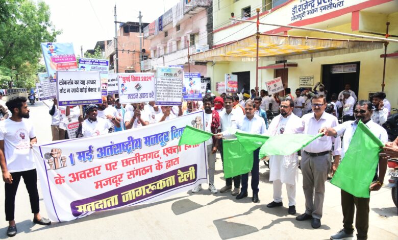 बिलासपुर, 01 मई 2024अंतर्राष्ट्रीय मजदूर दिवस के अवसर पर आज मतदाताओं को जागरूक करने शहर में श्रमवीरों की रैली निकली। सीईओ जिला पंचायत और स्वीप के नोडल अधिकारी श्री आर.पी. चौहान ने रैली को हरी झंडी दिखाकर रवाना किया। रैली इमलीपारा से होते हुए नेहरू चौक में समाप्त हुई। रैली के पूर्व सीईओ जिला पंचायत श्री चौहान ने सभी श्रमिकों को लोकसभा चुनाव सहित अन्य निर्वाचनों में अपने मताधिकार का अनिवार्य रूप से उपयोग करने की शपथ दिलायी। कार्यक्रम में जिला पंचायत के पीओ श्री ओम पाण्डेय, सहायक श्रमायुक्त श्री आर.के. प्रधान सहित बड़ी संख्या में श्रमिक मौजूद थे।