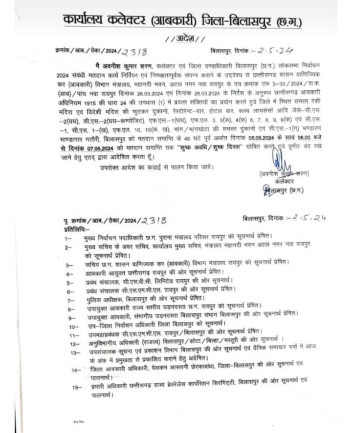 जिले में लोकसभा चुनाव 2024 को निर्विघ्न एवं निष्पक्षतापूर्वक संपन्न कराने के उद्देश्य से 5 मई से 7 मई 2024 मतदान समाप्ति तक जिले में शुष्क दिवस घोषित किया गया है। इस दौरान जिले की सभी मदिरा दुकानें बंद रखने के आदेश कलेक्टर एवं जिला निर्वाचन अधकारी ने दिए है। कलेक्टर एवं जिला निर्वाचन अधिकारी श्री अवनीश शरण ने छत्तीसगढ़ आबकारी अधिनियम 1915 की धारा 24 की उपधारा (1) में प्रदत्त शक्तियों का उपयोग करते हुए जिले में स्थित समस्त देशी मदिरा एवं विदेशी मदिरा फुटकर दुकानों, रेस्टोरेंट, बार, क्लब आदि की समस्त दुकानों, भण्डारण, भण्डागार गतौरी, बिलासपुर को मतदान समाप्ति के 48 घंटे के पूर्व अर्थात् 5 मई 2024 की शाम 6 बजे से 7 मई 2024 को मतदान समाप्ति तक शुष्क दिवस घोषित किया है एवं समस्त मदिरा दुकानों को उक्त अवधी में पूर्णतः बंद रखे जाने का आदेश दिया है। उपरोक्त आदेश का पालन कडाई से किए जाने के निर्देश कलेक्टर द्वारा पुलिस विभाग एवं आबकारी विभाग को दिए गए है।