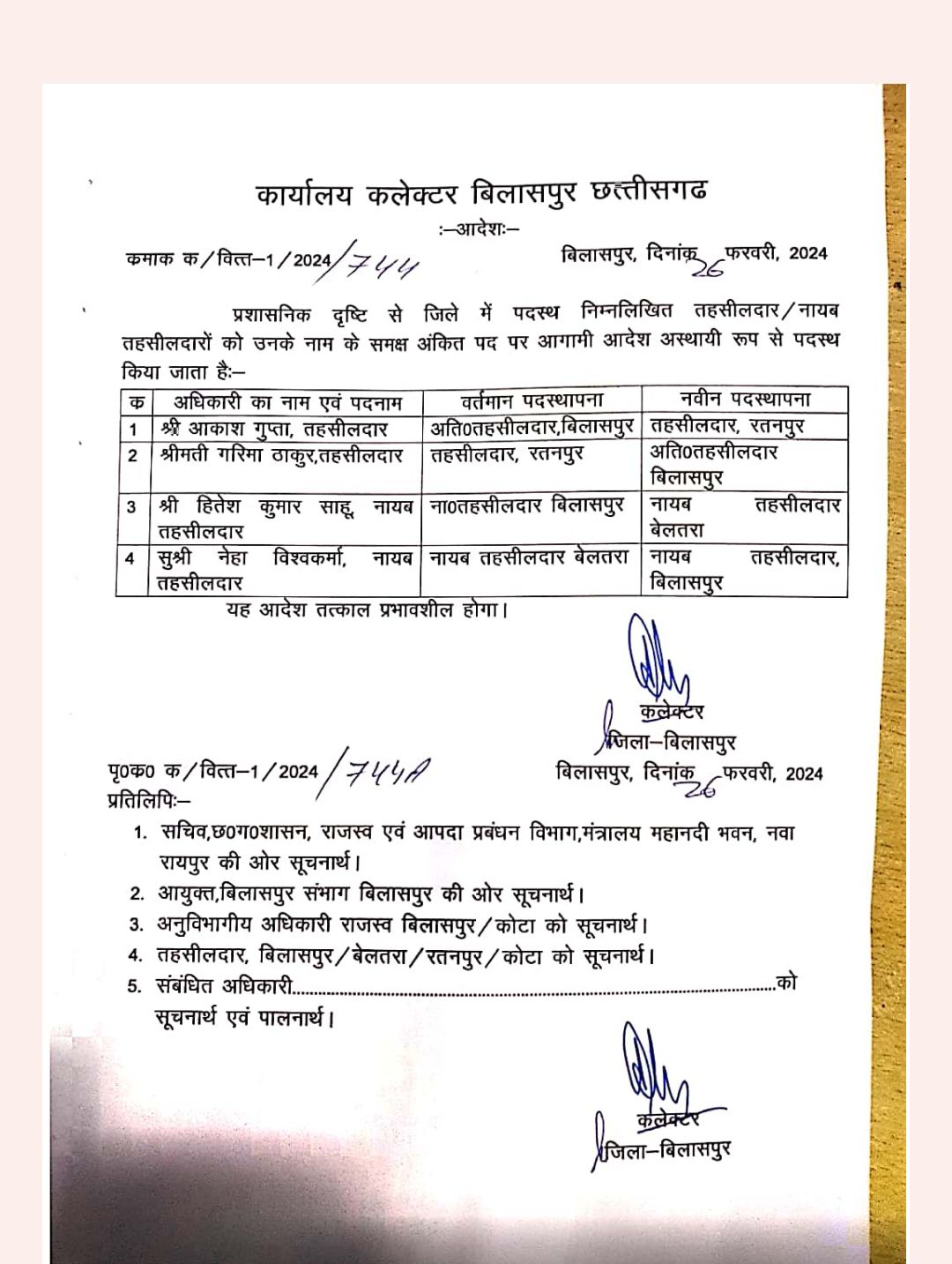 बिलासपुर- कलेक्टर अवनीश शरण ने प्रशासनिक दृष्टि से जिले में पदस्थ अधिकारियों तहसीलदार व नायब तहसीलदारों का तबादला आदेश जारी किया हैं,