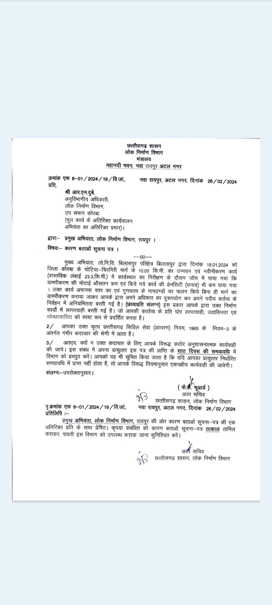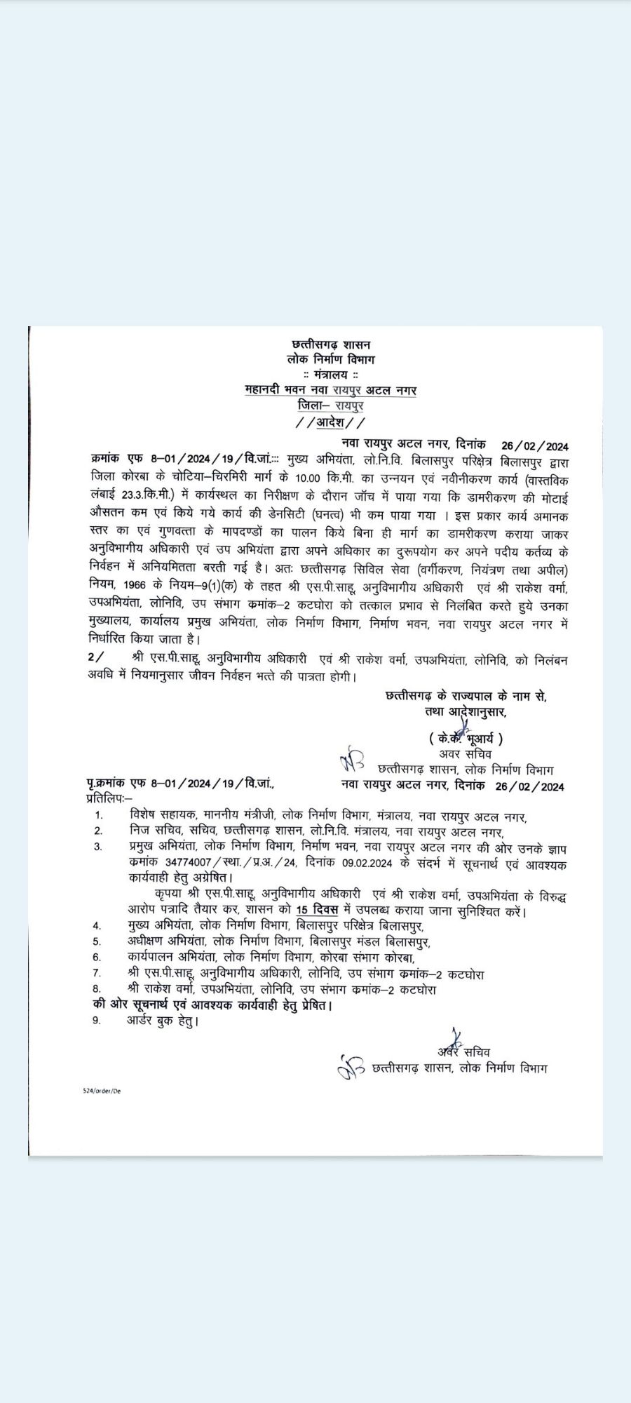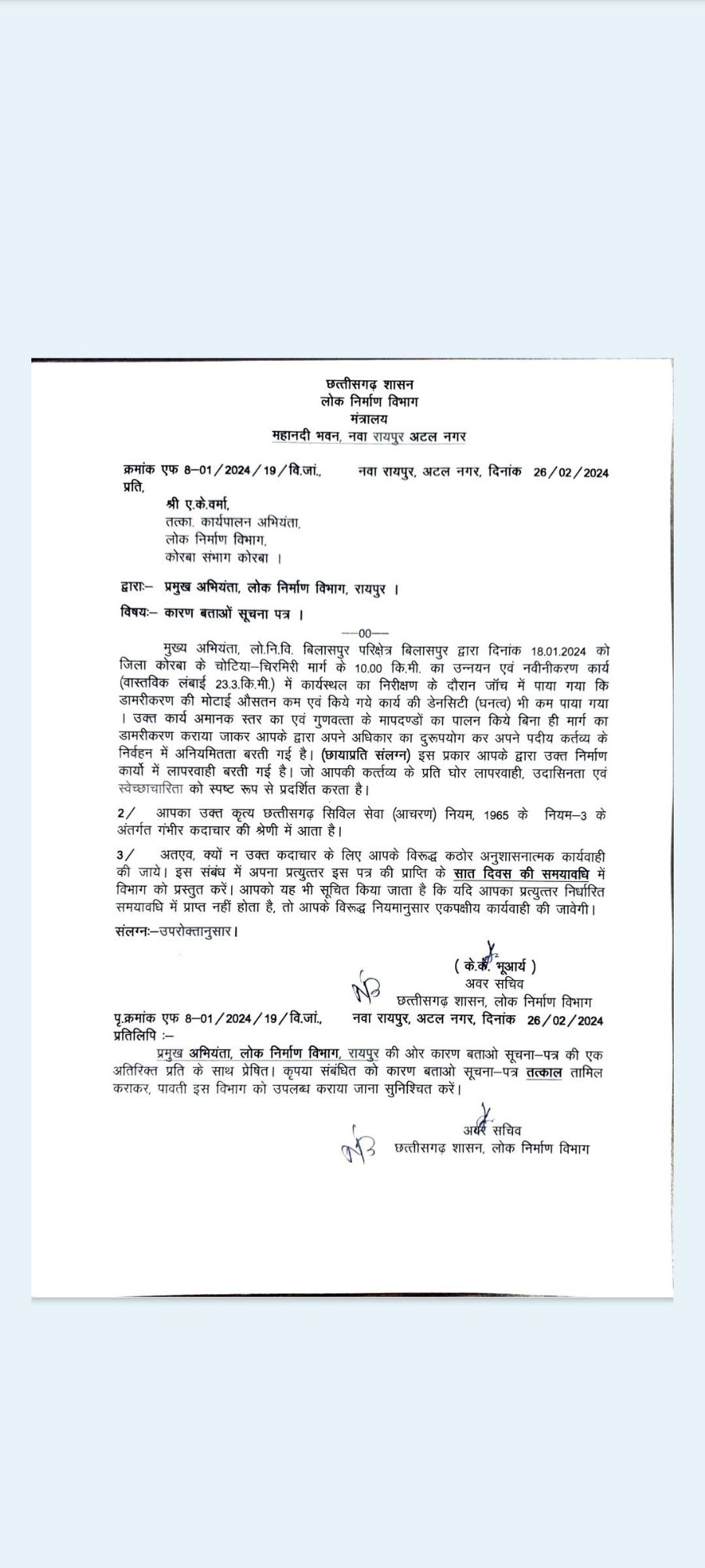 चोटिया-चिरमिरी मार्ग के उन्नयन और नवीनीकरण कार्य में गुणवत्ताहीन निर्माण और अमानक कार्य पर विभागीय मंत्री श्री अरुण साव ने की कड़ी कार्रवाई।