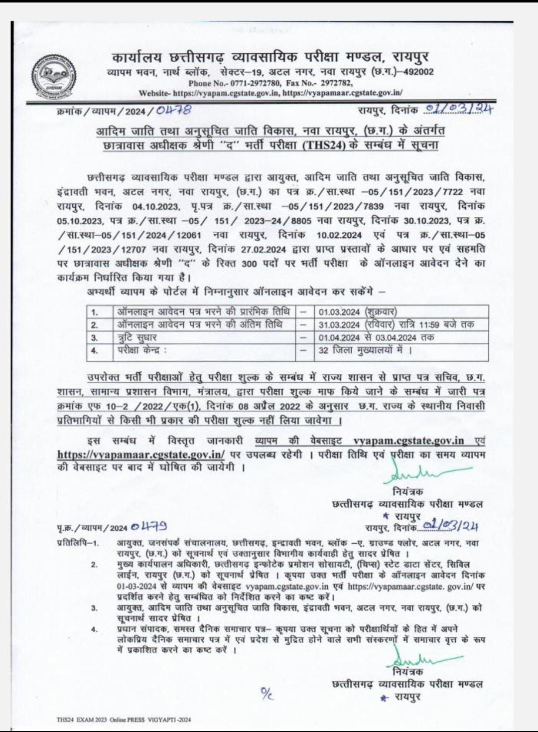 कार्यालय आयुक्त,आदिम जाति तथा अनुसूचित जाति विकास, इंद्रावती भवन, नवा रायपुर, अटल नगर रायपुर (छत्तीसगढ़) द्वारा छात्रावास अधीक्षक हॉस्टल वार्डन श्रेणी “द” के कुल 300 पदों पर सीधी भर्ती हेतु नोटिफिकेशन जारी कर दिया है।