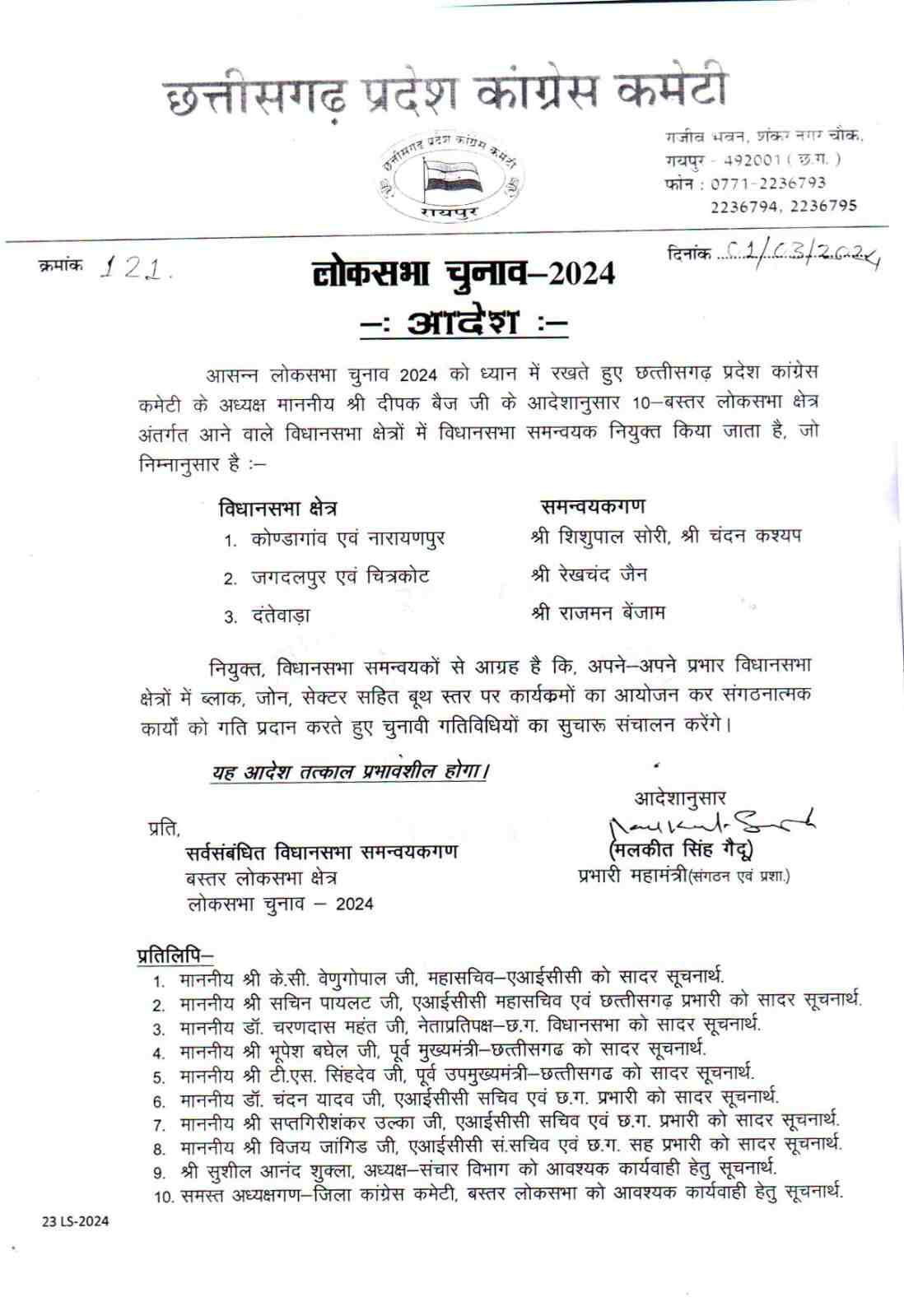 कांग्रेस ने बस्तर लोकसभा के अंतर्गत आने वाले विधानसभा क्षेत्रों में समन्वयकों की नियुक्त की है।